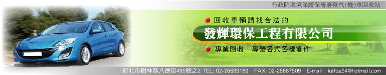 本公司是行政院環境保護署廢汽(機)車回收站,為國內知名回收廠,深受客戶信賴及各界好評。★車主自行開車至發輝環保公司,機車多貼您$500(共800)、汽車多貼您$10000(共11,000)視車種議價,或撥打專線電話0800-085070,免費到府拖吊。 ★報廢汽機車,請攜帶車主身分證正反影印一份,行照或報廢單影印兩份 公司行號請攜帶營業登記證,大小章,行照或報廢單影印兩份。